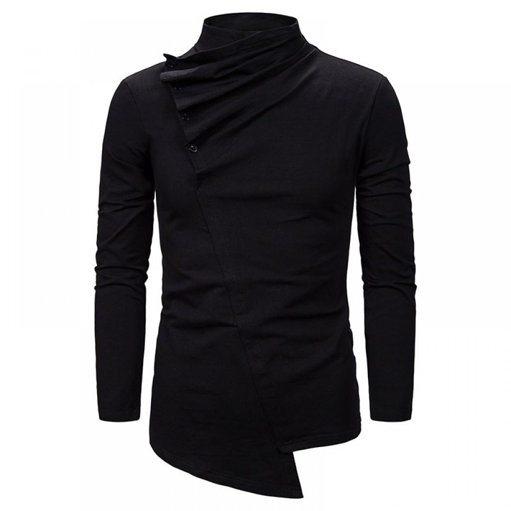 Men's Fashion Pile Collar Oblique Button Design Irregular Cut Slim Long-Sleeved T-Shirt