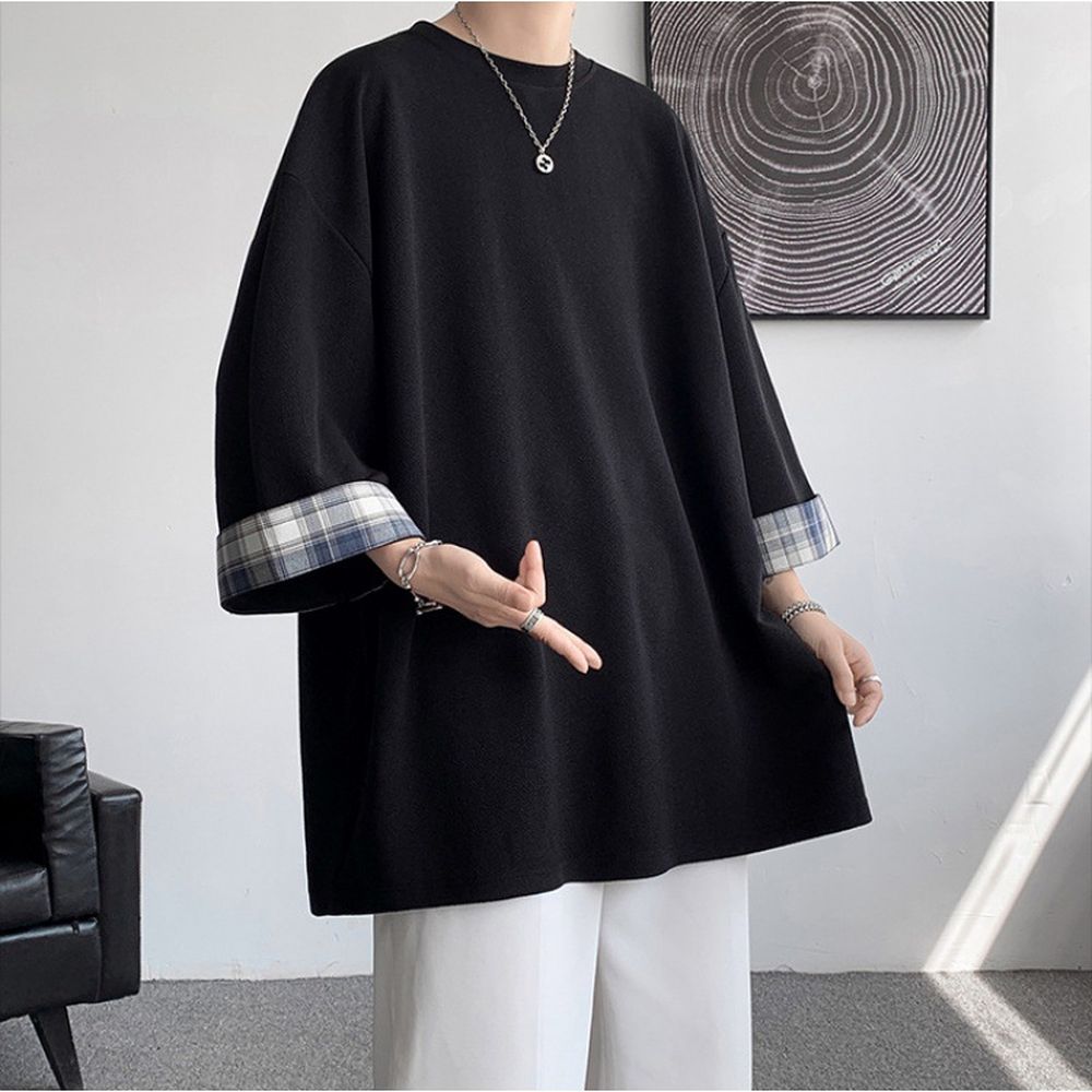 Men's Summer Plaid Patchwork Three-Quarter Sleeve T-Shirt